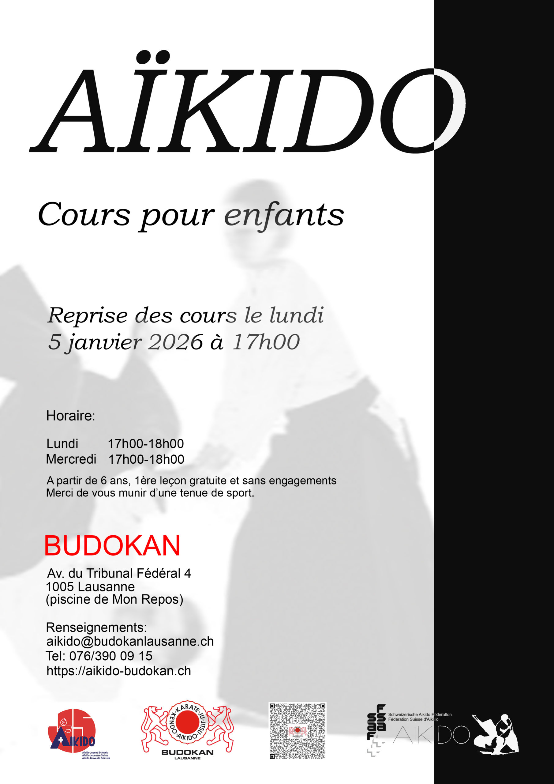 Pas de cours enfants pendant les vacances de fin d’année, fin des cours le mercredi 17 décembre à 18:00 et reprise des cours le lundi 05 janvier 2026 à 17:00