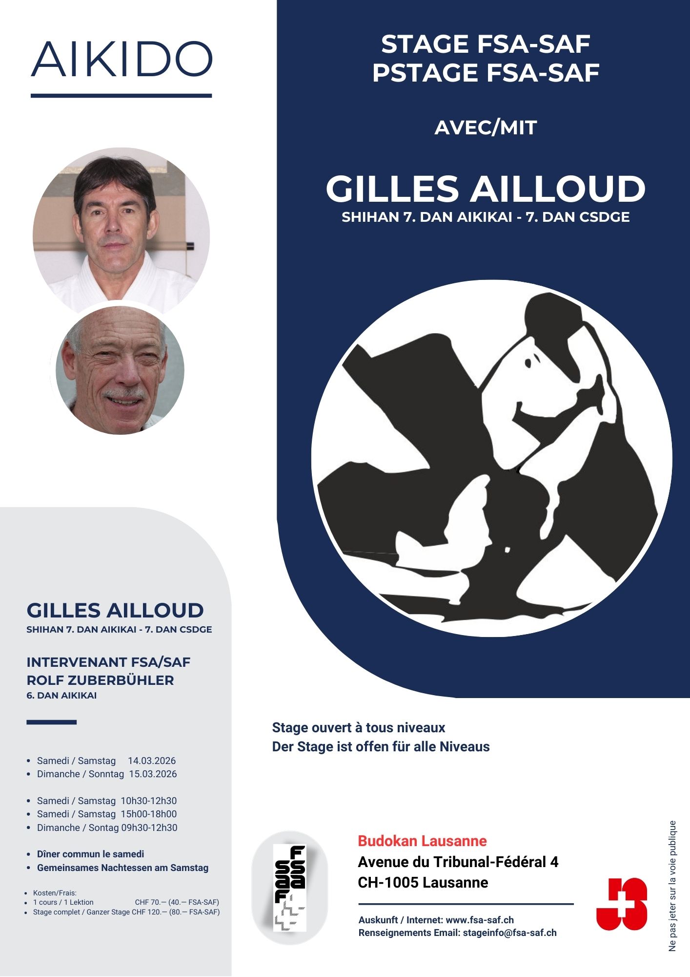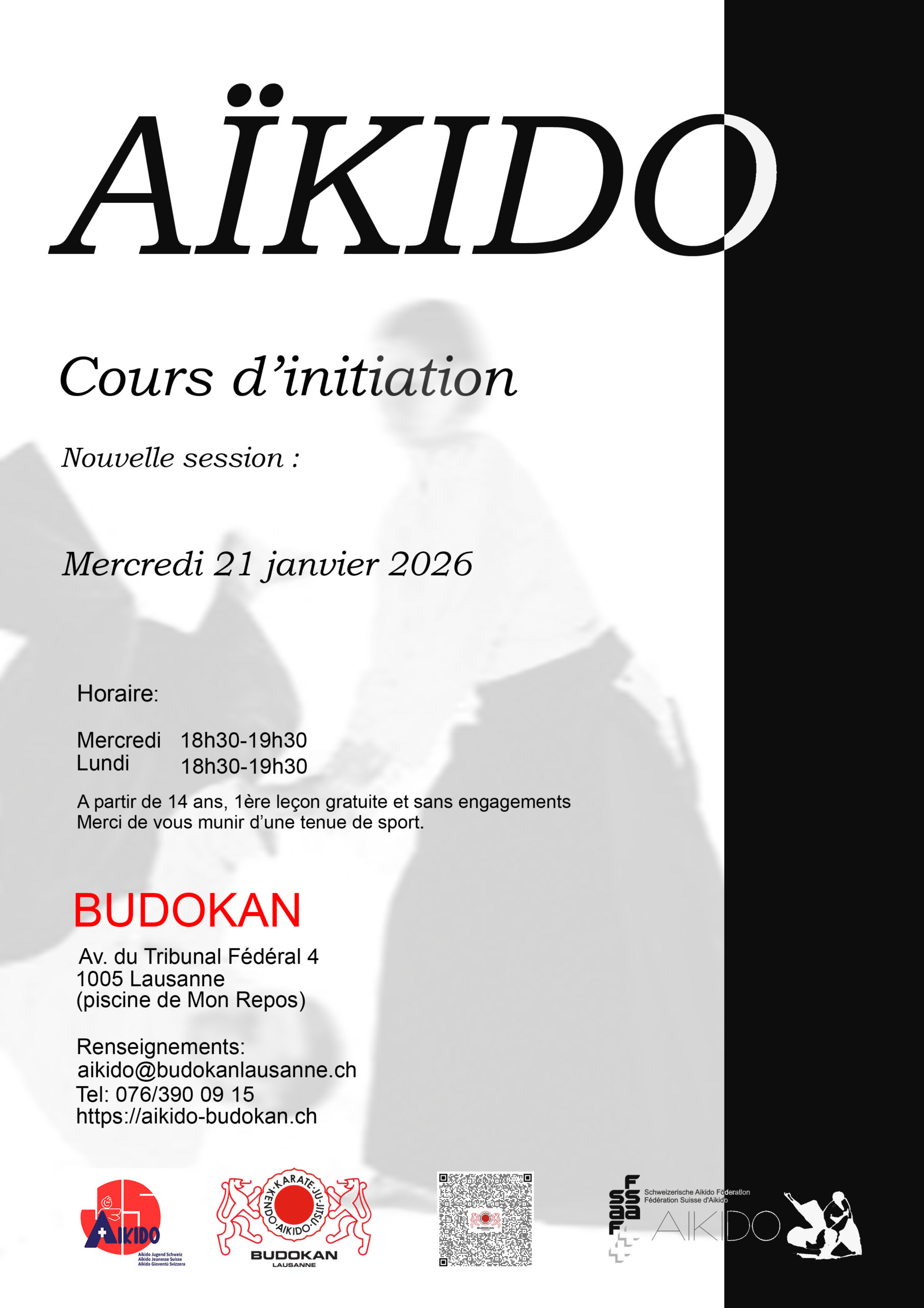 Le Budokan Lausanne Aïkido club est affilié à la Fédération Suisse d’Aïkido FSA. L’affiliation des membres est obligatoire. Chaque membre reçoit de la Fédération un passeport dans lequel sont inscrits les grades reçus ainsi que les stages suivis. Les membres de la FSA bénéficient de réductions sur les tarifs des stages.
